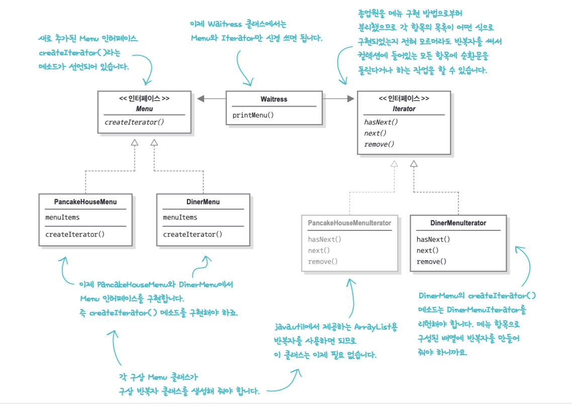 - 각 항목에 일일이 접근할 수 있게 해주는 기능을 집합체가 아닌 반복자 객체가 책임진다는 장점도 있다.