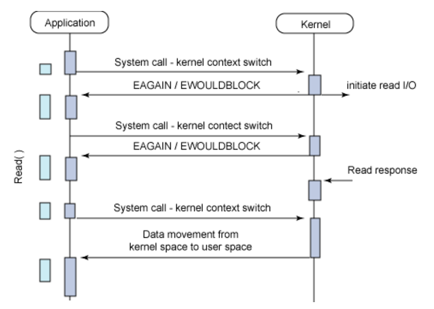 Application에서 I/O를 요청 후 바로 return되어 다른 작업을 수행하다가 특정 시간에 데이터가 준비가 다되었는지 상태를 확인하며, 데이터의 준비가 끝날 때까지 틈틈이 확인을 하다가 완료가 되었으면 종료된다.