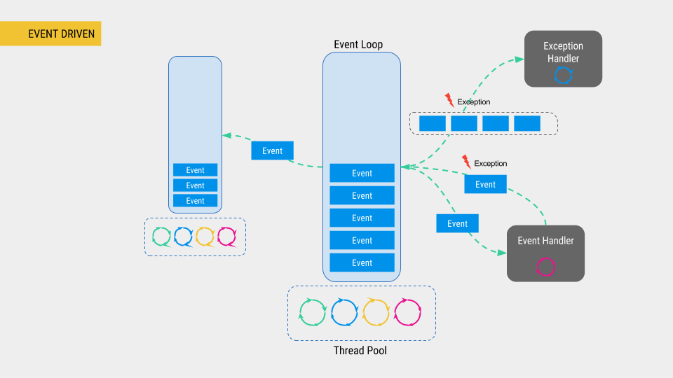 - 이벤트 루프는 few thread에서 계속 동작합니다.